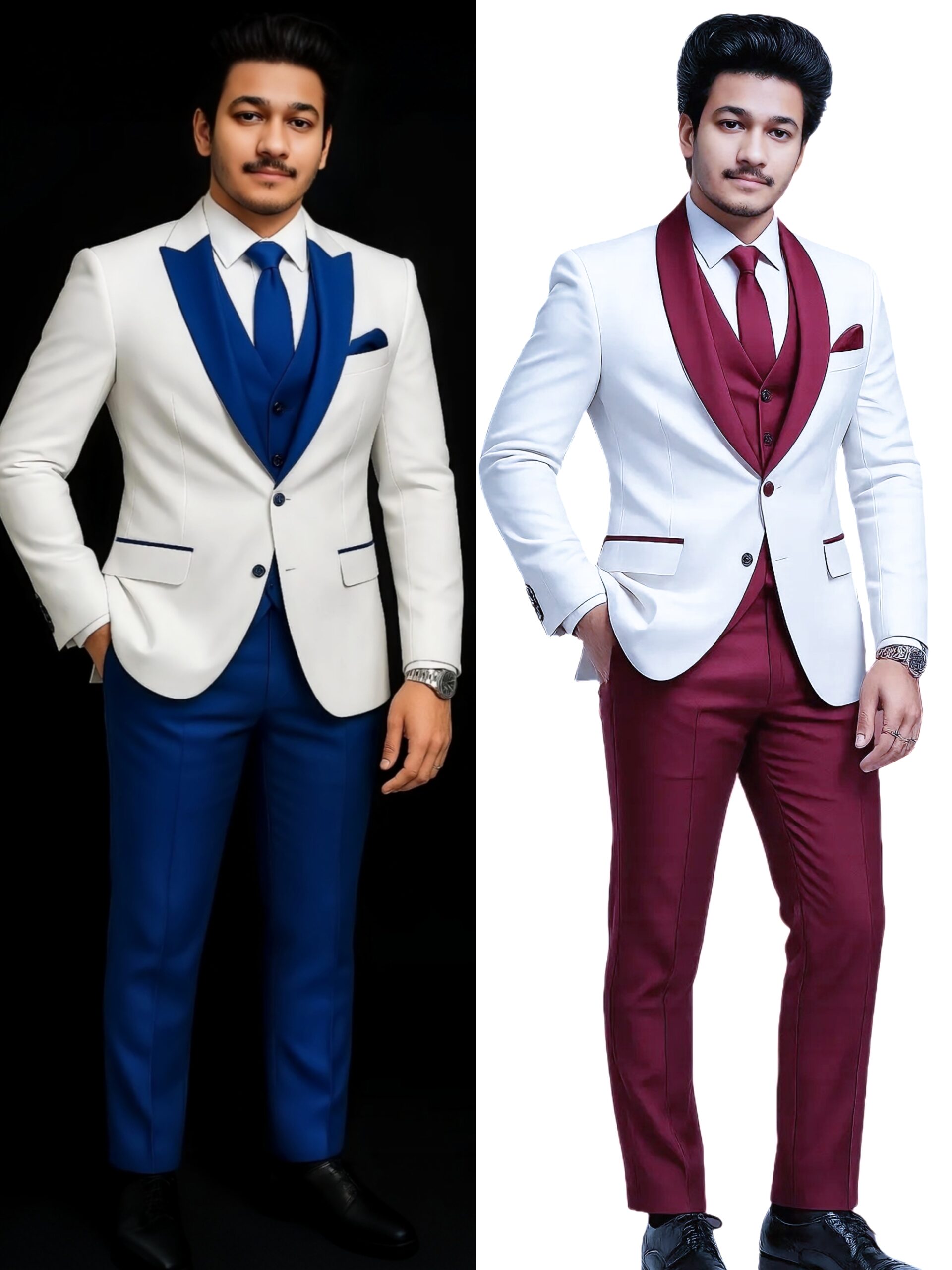 Premium contrast-lapel men’s suit featuring a white blazer paired with bold colour accents. Comes with matching waistcoat, tie, and trousers. Available in White–Blue and White–Red combinations. Perfect for weddings, parties, and special occasions.