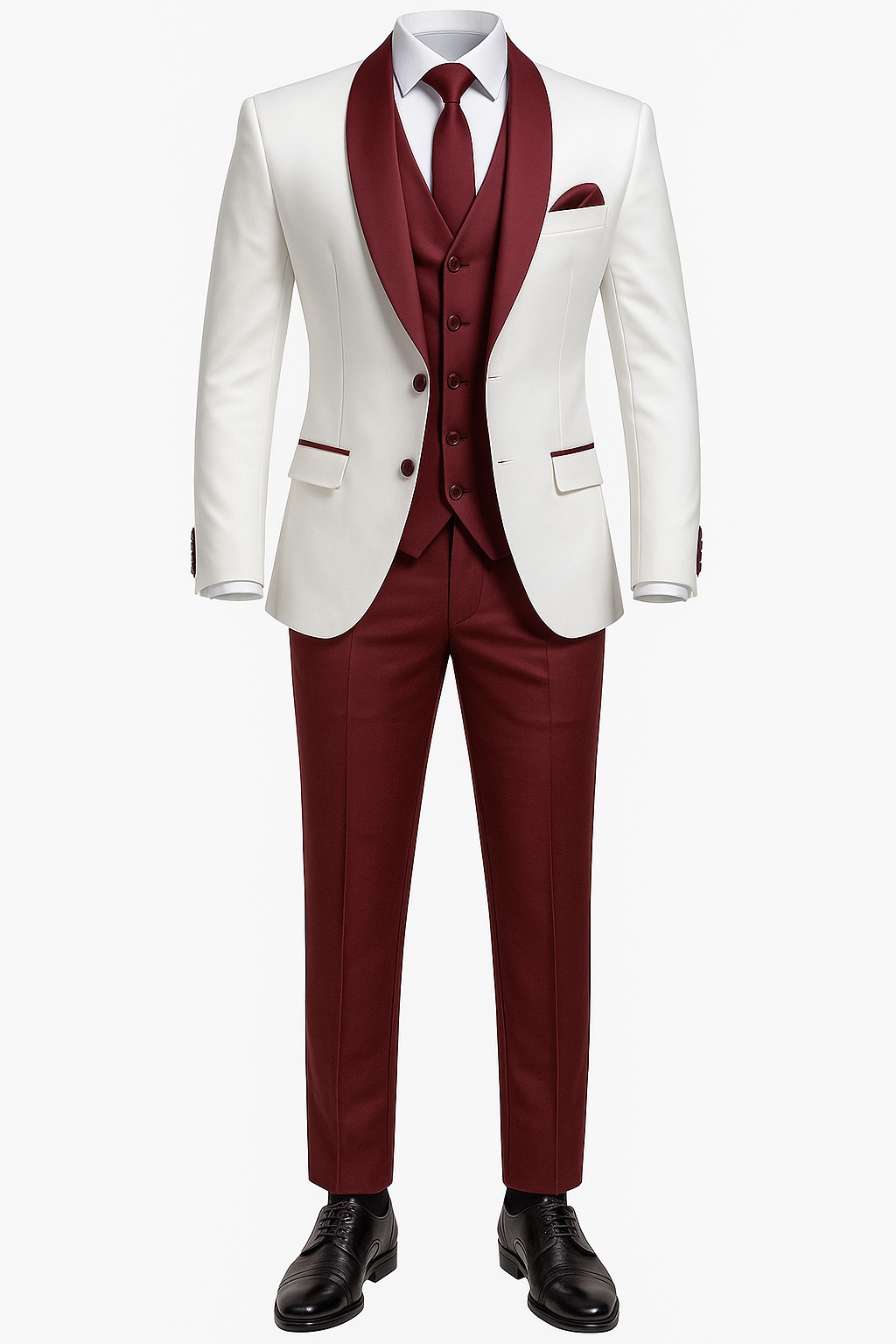 Elevate your formal wardrobe with this sophisticated White & Maroon Contrast Lapel Suit Set, designed for men who want a bold and refined look. The crisp white blazer is enhanced with elegant maroon lapel detailing, paired perfectly with maroon trousers and a matching waistcoat for a complete, sharply coordinated outfit.